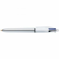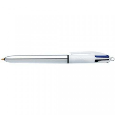 Multifunkční kuličkové pero s barevnými náplněmi - modrá, černá, červená a zelená. Stříbrná barva krytu dodává moderní kovový vzhled. Středně zúžený hrot pro hladké a úhledné psaní. Snadné zasunutí jediným stisknutím. Lze jej znovu naplnit novými náplněmi. S klipem pro připevnění na oblečení, kapsy nebo psací plochy.Kuličkové pero Bic, modré, 4 náplně