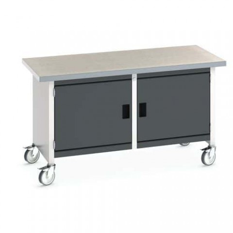Mobilní dílenské stoly Cubio Storage s pracovní deskou tl. 4 cm typu multiplex nebo linoleum. Nosnost až 300 kg, robustní svařovaná ocelová konstrukce, povrchová úprava práškovým lakem. Uzamykatelná skříňka s výškou dveří 50 cm, uvnitř pozinkovaná výškově nastavitelná police s nosností 100 kg. Dvě pevná a dvě otočná kola s brzdou o průměru 12,5 cm.Mobilní dílenský stůl Bott Cubio Storage, 84 x 150 x 75 cm, 2 skříňky, multiplex/linoleum