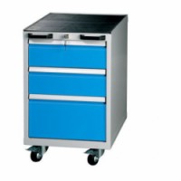 Pojízdný kontejner se třemi zásuvkami uloženými na ložiskových výsuvech je vyroben z ocelového plechu a disponuje dvěma pevnými a dvěma otočnými kolečky s brzdou. Kontejner pod stůl je uzamykatelný centrálním uzamykáním s blokací, která zabraňuje vysunutí více zásuvek najednou.Mobilní kontejner, 78 x 50 x 70 cm , 3 zásuvky