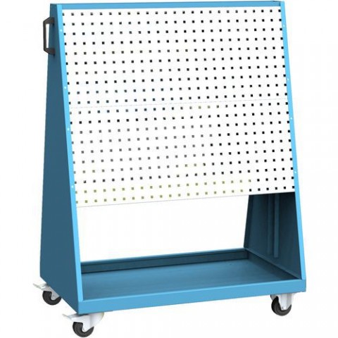 Nářaďový vozík sloužící pro přehlednější uložení a snadný přístup k nářadí se spodní policí. Mobilitu vozíku zaručují dvě pevná a dvě otočná kola s brzdou. Manipulace za pomocí plastových rukojetí. Rastrování perforovaného panelu 10 x 10 mm s roztečí 38 mm. Nosná část dílenské skříně je povrchově upravena práškovou barvou. Perforované panely jsou umístěny na obou stranách stojanu a jsou chráněny proti korozi pozinkováním. Nářaďový vozík má horní odkládací plochu se zvýšeným lemem a rýhovanou protiskluzovou gumou. Užitečný pomocník pro dílenské či servisní prostory. Jednotlivé vozíky se liší rozměrově. rozměry v x š x h: 127 x 96 x 60 cm materiál: ocelový plech nosnost: 160 kg nosnost na polici: 40 kg počet polic: 1 ks barva: modrá RAL 5012 hmotnost: 58 kg zkompletováno, perforováno 10 x 10 mm s roztečí 38 mm, horní odkládací plocha se zvýšeným lememMobilní pracovní stojan, 127 x 96 x 60 cm