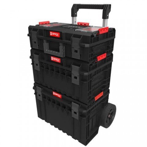 Pojízdná sada kufrů na nářadí pro pohodlný přenos ručního i elektrického nářadí. Dvojitá teleskopická rukojeť s možností odnímání. Pevná pogumovaná kola o průměru 223 mm s šířkou běhounu 58 mm jsou umístěná na kovové ose. Kufry s vnitřním dělením pro přehledné uspořádání nářadí.Mobilní sada kufrů na nářadí QBRICK One Profi 2.0