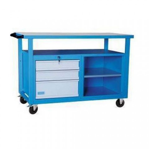 Mobilní pracovní stůl vhodný do dílen, pracoven i provozů. Pracovní deska stolu je vyrobena z lepeného smrkového dřeva o tloušťce čtyři centimetry a je vsazena do ocelového rámu. Stůl nabízí dvě police a tři centrálně uzamykatelné zásuvky. Pracovní stůl je osazen dvěma pevnými a dvěma otočnými kolečky s brzdou. Pro snadnější manipulaci je na boční straně umístěno plastové madlo. Povrchová úprava stolu je řešena pomocí kvalitní práškové barvy. Děliče zásuvek je možno použít pouze do menších zásuvek, tzn. s výškou 8,9 cm. rozměry v x š x h: 85 x 120 x 60 cm materiál: ocelový plech, tl. 0,7 - 0,8 mm rozměry pracovní desky v x š x h: 4 x 120 x 60 cm nosnost: 400 kg materiál pracovní desky: lepené smrkové dřevo výška zásuvky: 2 x 8,9; 1 x 16,7 cm počet zásuvek: 3 ks výsuv zásuvek: 100 % počet polic: 2 ks nosnost polic: 40 kg průměr koleček: 125 mm brzděná kolečka: ano barva konstrukce: modrá RAL 5015 barva pracovní desky: buk barva zásuvek: šedá RAL 7001 barva skříňky: šedá RAL 7001 barva pMobilní svařovaný dílenský stůl Rivt, 85 x 120 x 60 cm