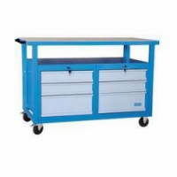 Mobilní pracovní stůl vhodný do dílen, pracoven i provozů. Robustní ocelová konstrukce svařovaná z jeklových profilů 40 x 40 mm. Pracovní deska stolu je vyrobena z lepeného smrkového dřeva, oboustranně dýhovaná bukovou překližkou. Stůl nabízí celkem šest centrálně uzamykatelných zásuvek s cylindrickým zámkem. Nosnost zásuvky je 40 kg. Vysouvací zásuvky jsou usazeny na kuličkových lištách. Povrch je ošetřen polyesterovým vypalovaným práškovým lakem. Stůl je osazen čtyřmi otočnými kolečky o průměru O 125 mm. Dvě kolečka s brzdou, dvě bez brzdy. Plastová rukojeť pro snažší manipulaci. K tomuto stolu je možno dokoupit (není součástí balení) dělící příčku pro dvě horní zásuvky.Mobilní svařovaný dílenský stůl Rivt, 85 x 120 x 60 cm