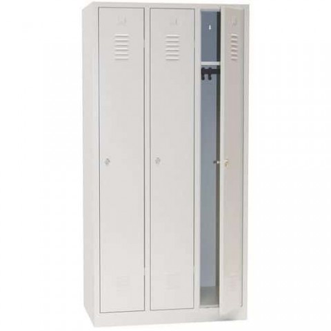 Montovaná kovová skříň se třemi oddíly do pracovní nebo školní šatny. Křídlové dveře jsou zavěšené na vnitřních pantech a lze je otevřít až o 115 °. Tiché dovírání díky plastovým dorazům. Možnost umístění jmenovky do štítku na dveřích. Kryté perforované otvory v horní části dveří zajišťují cirkulaci vzduchu. Odkládací polička ve vrchní části skříně, tyč se dvěma háčky pro zavěšení oděvů. Celokovová konstrukce z ocelového plechu tl. 0,6 mm. Skříň je umístěná na vyvýšeném soklu. Uzamykání pomocí cylindrického zámku (dodáváno se 2 klíči) nebo otočným uzávěrem v kombinaci s visacím zámkem (výška třměnu 40 mm, průměr tměnu 6 mm).Montované šatní skříně Manutan Expert IS, 3 oddíly