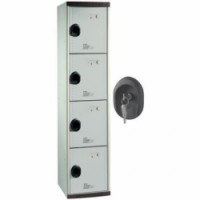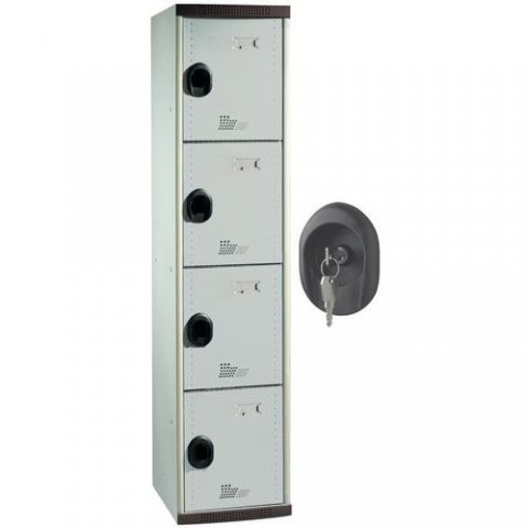 Boxové skříňky se čtyřmi samostatně uzamykatelnými schránkami. Vyrobené z ocelového plechu tl. 0,6 mm. Cirkulaci vzduchu zajišťuje perforace na dveřích. Otevírání dvířek v rozsahu až 120°. Možnost umístění jmenovky do štítku na dveřích. Uzamykání každého boxu cylindrickým zámkem (dodáváno se 2 klíči na 1 zámek).Montované šatní skříně Optimum, 4 boxy, cylindrický zámek