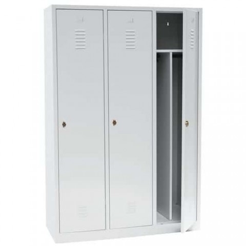 Sestava tří šatních skříněk na čisté a špinavé prádlo s vnitřním dělením mezistěnou. Křídlové dveře jsou zavěšené na vnitřních pantech a lze je otevřít až o 115 °. Tiché dovírání díky plastovým dorazům. Možnost umístění jmenovky do štítku na dveřích. Kryté perforované otvory v horní části dveří zajišťují cirkulaci vzduchu. Odkládací polička ve vrchní části skříně, tyč se dvěma háčky pro zavěšení oděvů. Celokovová konstrukce z ocelového plechu tl. 0,6 mm. Skříň je umístěná na vyvýšeném soklu. Uzamykání pomocí cylindrického zámku (dodáváno se 2 klíči) nebo otočným uzávěrem v kombinaci s visacím zámkem (výška třměnu 40 mm, průměr tměnu 6 mm).Montované šatní skříně s mezistěnou Manutan Expert IS, 3 oddíly