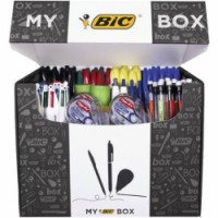 Krabice se 124 psacími potřebami, včetně: 54 kuličkových per Cristal (22 modrých, 20 černých, 6 červených a 6 zelených). 14 x 4 barvy kuličkových per (10 originálních, 4 s úchopem). 24 mechanických tužek Bic Matic Original HB 0,7 mm. 8 x mini kapesní korekční pásky 5 mm x 6 m. 3 x permanentních fixů 2000 (1 modrý, 1 černý, 1 červený). 1 x 1445 permanentní popisovač, černý. 3 x stíratelné fixy Velleda 1701 (1 černý, 1 modrý, 1 červený). 8 x žluté zvýrazňovače Brite Liner Grip s dlátovým hrotem. 3 x Atlantis Soft kuličková pera, modrá. 2 x kuličková pera Atlantis Exact (1 modré, 1 černé). 2 x 4 barvy kuličkových per Shine. 2 x 21 g lepicí tyčinky.My BIC box, sada se 124 psacími a korekčními výrobky