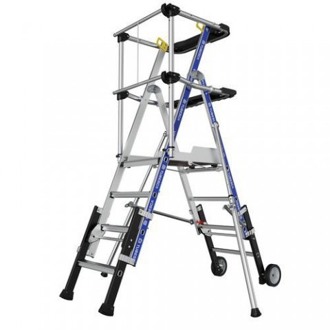 Nastavitelné platformy Sherpascopic. Pevné 4stranné zábradlí s ochrannými lištami proti pádu s poloautomatickým zavíráním. Protiskluzové schůdky 80 mm (pevná plocha) a 60 mm (teleskopická plocha). Odnímatelný přihrádkový držák nářadí - nosnost 25 kg, s integrovanými háčky (max. 10 kg). Vysoce komfortní 590 x 400 mm protiskluzová platforma ze dřeva. Výsuvné stabilizátory s milimetrovým nastavením. Teleskopické roviny umožňující posun úrovní. Intuitivní a bezpečný systém nastavení výšky, nastavení každých 23 cm (po krocích). Součástí jsou dvě kola o průměru 175 mm.Nastavitelné hliníkové plošiny Sherpascopic Tubesca-Comabi