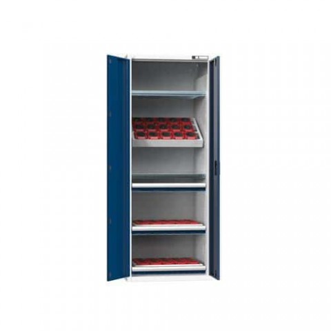 NC skříně jsou opatřeny dvojitými stěnami s perforací pro zavěšení polic, nosičů, nástrojových rámů a zásuvek. V případě vybavení skříne zásuvkami je standardně, z důvodu bezpečnosti (nebezpečí převrácení), dodávána blokace proti vysunutí více zásuvek. Korpus skříně se uzavírá křídlovými dveřmi s panty otočnými o 180°. Zamykání cylindrickým rozvorovým zámkem. Standardní výbavou je systém identifikace otvorů a popisový štítek s funkcí chytrý nábytek. Do skříní je možné zavěšovat zásuvky s půdorysem ZD (36x27).NC skříně s křídlovými dveřmi 36x27D s vybavením, var. 7
