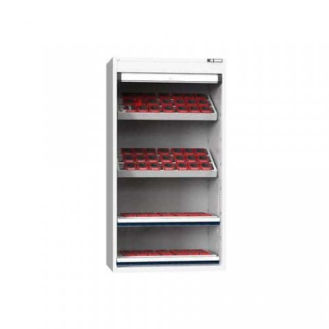 NC skříně jsou opatřeny dvojitými stěnami s perforací pro zavěšení polic, nosičů, nástrojových rámů a zásuvek. V případě vybavení skříne zásuvkami je standardně, z důvodu bezpečnosti (nebezpečí převrácení), dodávána blokace proti vysunutí více zásuvek. Korpus skříně se uzavírá hliníkovou roletou světle šedé barvy RAL 7035 s rozvorovým zámkem. Standardní výbavou je systém identifikace otvorů a popisový štítek s funkcí chytrý nábytek. Do skříní je možné zavěšovat zásuvky s půdorysem ZC (54x27).NC skříně s roletou 54x27D s vybavením, var. 7