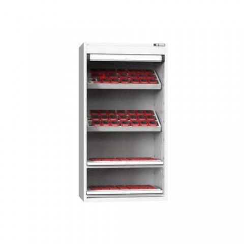 NC skříně jsou opatřeny dvojitými stěnami s perforací pro zavěšení polic, nosičů, nástrojových rámů a zásuvek. V případě vybavení skříne z??suvkami je standardně, z důvodu bezpečnosti (nebezpečí převrácení), dodávána blokace proti vysunutí více zásuvek. Korpus skříně se uzavírá hliníkovou roletou světle šedé barvy RAL 7035 s rozvorovým zámkem. Standardní výbavou je systém identifikace otvorů a popisový štítek s funkcí chytrý nábytek. Do skříní je možné zavěšovat zásuvky s půdorysem ZC (54x27).NC skříně s roletou 54x27D s vybavením, var. 8