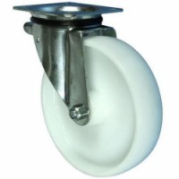 Otočná průmyslová kola s obručí z bílého nylonu a s dvouřadým kuličkovým věncem ve vidlicové hlavě. typ kol: otočná materiál kol: nylon průměr kola: 125 - 200 mm šířka kola: 45 mm nosnost: 400 kg způsob uchycení: vidlice s přírubou výška kola s vidlicí: 161 - 235 mm vyložení kola: 43 - 57 mm ložiska: kluzná povrchová úprava pozinkováním, dvouřadý kuličkový věnec ve vidlicové hlavě, teplotní odolnost -40 až +80 °C, odolné proti koroziNylonová transportní kola s přírubou, průměr 125 - 200 mm, otočná, kluzná ložiska