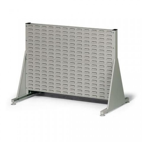 Oboustranný stacionární regál tvoří kombinace nosných vertikálních prvků a děrovaných výplní upevněných na kovových nožkách. K dispozici ve dvou barevných variantách.Oboustranný PERFO regál, výška 78 cm