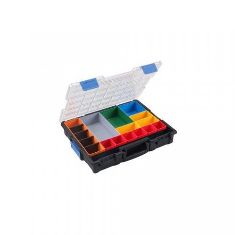Plastový organizér pro uložení šroubů, matic, podložek a dalšího drobného materiálu. Uzavřením víka se uzavřou jednotlivé oddíly a je tak zajištěno, že se součástky nepomíchají. Praktická rukojeť, průhledné víko pro rychlou kontrolu obsahu. Možnost spojení až 3 organizérů dohromady pomocí bočních klipů, max 36 kg. Kompatibilní s děliči pro organizér Europlus. Oddíly lze libovolně kombinovat.Organizér Allit Europlus Pro, 18 přihrádek