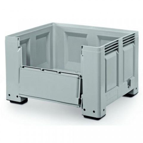 Stabilní bigboxy s pevnou konstrukcí a plnými stěnami. Boční otevírání na delší straně usnadňuje přístup k uloženému materiálu. Paletové kontejnery jsou vyrobeny z vysokohustotního polyetylenu. Zaoblené hrany a okraje zajišťují vyšší bezpečnost při obsluze. Vhodné pro použití v potravinářském průmyslu. Snadno omyvatelné.Paletové kontejnery s bočním otevíráním, 480 - 620 l