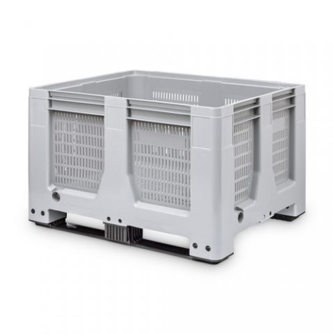 Plastový paletový kontejner se dvěma ližinami. Neustálý přístup vzduchu ke zboží díky perforovaným stěnám i dnu. Vyroben z vysokohustotního polyetylenu. Vyšší bezpečnost a snadnou omyvatelnost zajišťují zaoblené hrany a okraje. Kontejner lze doplnit víkem.Paletový kontejner MaxiLog s perforovanými stěnami, 2 ližiny, 610 l