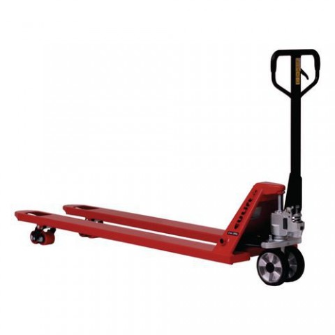 Vozík na palety s vidlicemi délky 180 cm je vhodný k manipulaci dlouhých břemen nebo speciálních palet do hmotnosti 2 000 kg. Pohodlné ovládání díky ergonomické pryžové rukojeti. Vidlicová kola jsou v tandemovém provedení. nosnost: 2 000 kg délka vidlic: 180 cm šířka vidlice: 16 cm vnější šířka vidlic: 54,2 cm maximální výška zdvihu: 19,5 cm minimální výška zdvihu: 8,7 cm počet kol ve vidlicích: tandem materiál kol: řídící guma; vidlicová polyuretan průměr kol: řídící 200 mm; vidlicová 80 mm ložiska: kuličková rozměry d x š x v: 217 x 56 x 125 cm materiál: ocel barva: červená hmotnost: 120 kgPaletový vozík BF1800AR s dlouhými vidlicemi, do 2000 kg, gumová řídicí kola