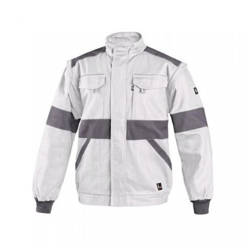Bílá pánská montérková blůza s šedými doplňky. Náprsní a přední kapsy schovají telefon, metr a další drobné předměty potřebné k práci. Praktické nošení zajišťuje stahovací guma v pase a rukávy zakončené pružnou manžetou. Odepnutím rukávů lze blůzu během chvilky proměnit ve vestu. Kryté zapínání na zip a zapínání u krku.Pánská montérková blůza CXS, bílá/šedá