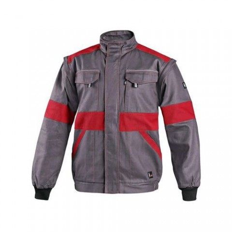 Šedá pánská montérková blůza s červenými doplňky. Náprsní a přední kapsy schovají telefon, metr a další drobné předměty potřebné k práci. Praktické nošení zajišťuje stahovací guma v pase a rukávy zakončené pružnou manžetou. Odepnutím rukávů lze blůzu během chvilky proměnit ve vestu. Kryté zapínání na zip a zapínání u krku.Pánská montérková blůza CXS, šedá/červená