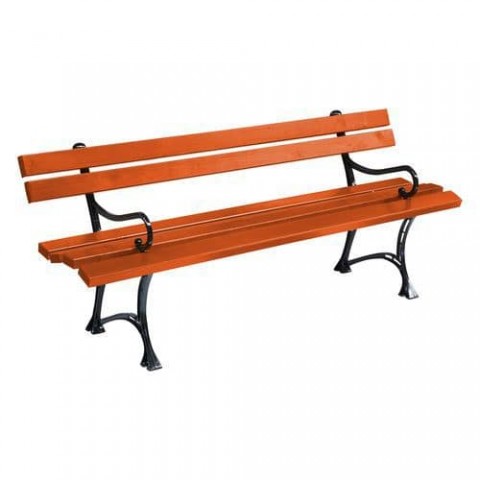 Tvarovaná dřevěná lavička pro venkovní posezení na hřišti, v parku aj. Latě ze smrkového dřeva v různém barevném provedení. Kovová ozdobná konstrukce v černé barvě.Parkové lavičky Beauty s opěradlem a područkami