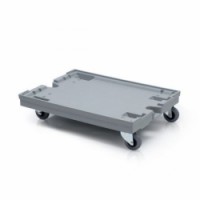Plastová přepravní plošina pro přepravky o rozměru 80 x 60 cm, plochu lze využít i pro více malých přepravek. Mírně vyvýšené hrany pro lepší stabilitu převáženého nákladu. Vyrobená z polypropylenu. Prohlubně na plošině umožňují stohování více plošin na sebe. Opatřena čtyřmi otočnými gumovými koly.Plastová přepravní plošina na přepravky, 4 otočná gumová kola, do 500 kg