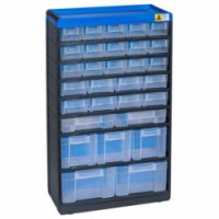 Plastové organizéry se zásuvkami řady VarioPlus Pro se vyznačují velmi robustním provedením. Vysoká stabilita díky přihrádkám z plastových profilů. Vysoká nosnost díky ocelovému obložení spodní části přihrádek. Zásuvky jsou zajištěny proti vypadnutí. Možnost čtyřbodové montáže na stěnu. Vhodné pro profesionální použití (např. pro skladování součástek a jiných dílů). Horní část organizéru vhodná např. pro odkládání nářadí. Dodáváno včetně děličů do zásuvek.Plastový organizér VarioPlus Pro 53/60, 30 zásuvek