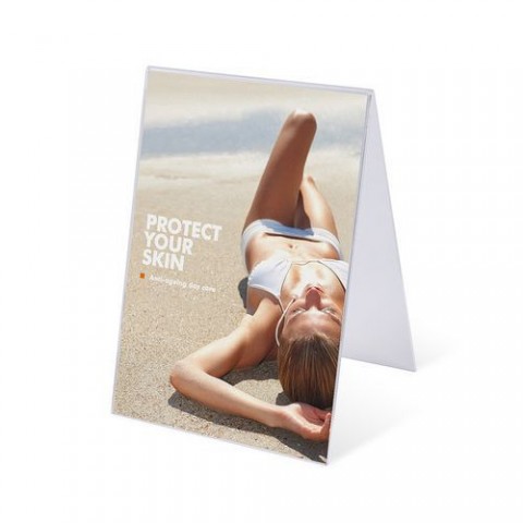 Pultové prezentační stojánky tvaru A z plexiskla. Vhodné jako stojánek na menu do restaurací. Orientované na výšku. Dvoustranný pohled.Plexi stojánky na letáky JD6, typ A na výšku