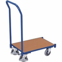 Plošinové vozíky s ložnou plochou z MDF desky. Ložná plocha je v jedné rovině s rámem. Vhodné pro umístění přepravek o rozměru 600 x 400 mm. Nakládací výška 205 mm. Šedá kola z termoplastické pryže nezanechávající stopy na plastovém ráfku s přesnými kuličkovými ložisky, ochrana nohou.Plošinové vozíky s madlem Euro systém, do 250 kg, 74 x 41,5 x 97 cm