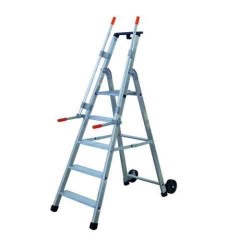 Mobilní schůdky s pěti stupni a plastovým držákem na nářadí. Bezpečnostní zábradlí podél schůdků s plastovými koncovkami. Lehkou manipulaci zajišťují dvě kolečka a madla. Příčky mají šíři 10 cm, což umožňuje pohodlný a bezpečný došlap.Pojízdné hliníkové schůdky Facal s držákem, 5 stupňů