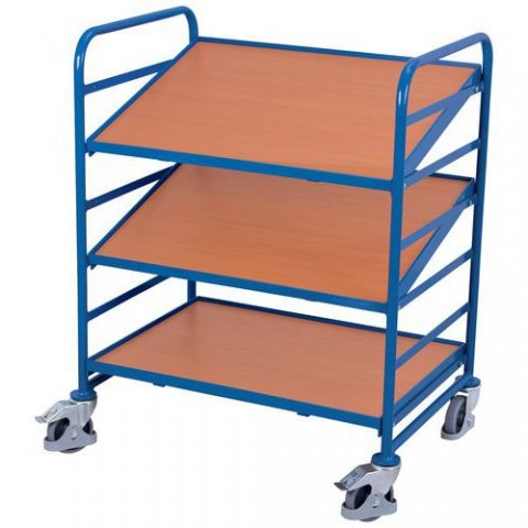 Vozík se třemi policemi z bukových MDF desek. Naklonění horní a prostřední police o 17° nebo 32°, nosnost 50 kg na polici. Vzdálenost mezi příčnými trubkami 125 mm. Rozteč otvorů pro přišroubování polic 150 mm. 4 otočná kola, z nichž dvě jsou opatřená brzdou. Šedá kola z termoplastické pryže nezanechávající stopy na plastovém ráfku s přesnými kuličkovými ložisky.Policové vozíky Euro se šikmými policemi, 3 police, 93,5 x 66,5 x 112,5 cm
