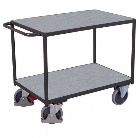 Policové vozíky se dvěma policemi vhodné do skladů pro přepravu zboží a materiálu. Police jsou vyrobené z MDF desek pokrytých pozinkovaným plechem. Pojízdnost zajišťují čtyři kola s valivými kuličkovými ložisky, z nichž dvě jsou pevná a dvě otočná s brzdou Easy Stop a ochrannými kryty.Policové vozíky s madlem, do 500 kg, 2 police