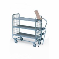 Policový vozík se dvěma policemi vybavené praktickými schůdky. Schůdky umožňují vystoupit do výšky 60 cm nad podlahu, jednoduše se rozkládají a automaticky stahují. Povrch schůdků zabraňuje uklouznutí. Vozík je vybaven držákem na dokumenty formátu A4. Police pokryté odolným laminátovým nátěrem lze z vozíku odnímat. Kratší strany vozíku jsou opatřené mřížovými bočnicemi s oky 50 x 100 mm. Pojezd zajišťují čtyři otočná kola s valivými kuličkovými ložisky. Povrchová úprava pozinkováním.Policový vozík Ergobjorn se schůdky, do 300 kg, 3 police