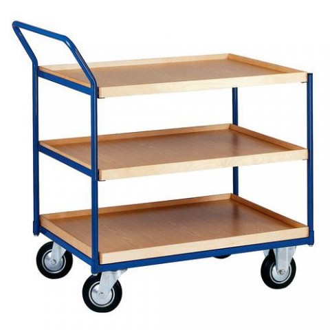 Vozík se třemi policemi vhodný pro přepravu zboží a materiálu ve skladech. Police vyrobené z laminované dřevotřísky jsou opatřené vyvýšenými hranami, které zabraňují vypadávání předmětů z vozíku. Pojízdnost zajišťují čtyři kola s valivými jehlovými ložisky, z nichž dvě jsou pevná a dvě otočná. Kola jsou opatřena poklicemi, které brání zanášení ložiska různými nečistotami. Povrchová úprava vypalovací barvou.Policový vozík s madlem, do 200 kg, 3 police s vyvýšenou hranou