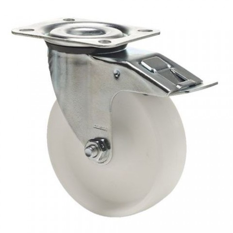 Transportní otočná kolečka s brzdou vyrobená z polyamidu. Odolná vůči mnoha chemikáliím, jako jsou oleje, benzín a rozpouštědla. Vybavená podvojnými kuličkovými ložisky. Tvrdost běhounu je 75° Shore D.Polyamidová transportní kola s přírubou, průměr 160 - 200 mm, otočná s brzdou, kuličková ložiska
