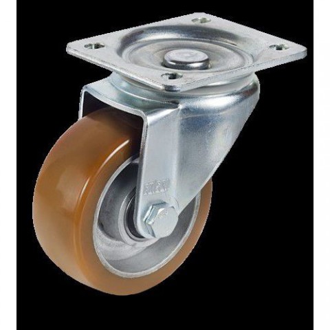 Transportní otočné kolo o průměru 100 mm s polyuretanovým běhounem. Běhoun odolný vůči bočním nárazům a mnoha chemikáliím, nezanechává stopy na podlaze a zaručuje tichý chod. Dvojitá utěsněná kuličková ložiska. Tvrdost běhoun 92° Shore A.Polyuretanové transportní kolo s přírubou, průměr 100 mm, otočné, kuličková ložiska