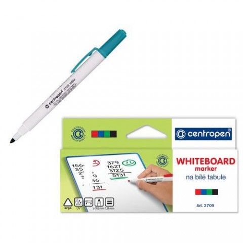 Sada značkovačů na bílé stíratelné tabule s ergo úchopovým držením. Vhodné na film, fólie, kov, plast, pryž, sklo, porcelán. Za sucha stíratelný, permanentní, světlostálý inkoust na alkoholové bázi, zdravotně nezávadný, bez zápachu. Skladovat ve vodorovné poloze, případně hrotem dolů. Ventilační chránítko. Po použití uzavřít. Mix barev. Válcový hrot.Popisovač CENTROPEN 2709/4 sada stíratelný