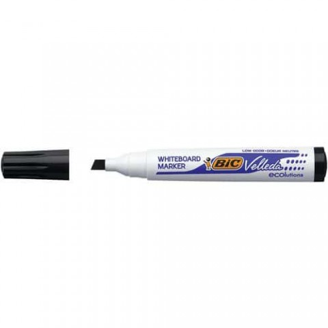 Suchý popisovač se širokým šikmým hrotem. Šířka čáry mezi 3,7 mm a 5,5 mm. Inkoust na bázi alkoholu. Nízký zápach a snadné vymazání po zaschnutí i po několika dnech. Odolný a nezatahovací hrot, který odolává tlaku. Vyrobeno ve Francii z 52 % z recyklovaného materiálu (kromě systému inkoustu).Popisovače Velleda, stíratelné za sucha, 12 ks