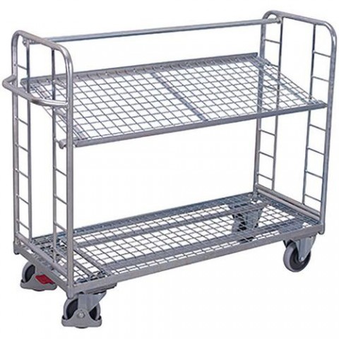 Pozinkovaný vozík se spodní pevnou a vrchní variabilní mřížovou policí. Rozměr oka police 50 x 50 mm, sklon 15°, výška hrany 15 mm. Interval uchycení police 120 mm. Madlo na čelní straně vozíku. 2 pevná a 2 otočná kola s brzdou EasySTOP. Šedá kola z termoplastické pryže nezanechávající stopy na plastovém ráfku s přesnými kuličkovými ložisky.Pozinkované policové vozíky se šikmými mřížovými policemi, 2 police