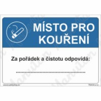 Bezpečnostní značení tabulkou, značkou nebo samolepkou "Místo pro kouření" je tištěno na vysoce kvalitním materiálu, barvami s vysokou odolností proti otěru a UV záření. Provedení je plně v souladu s požadavky právních a technických předpisů, zejména Nařízení vlády č. 375/2017 Sb., ČSN ISO 3864-1, ČSN ISO 3864-2, ČSN ISO 3864-3, ČSN ISO 3864-4. Bezpečnostní tabulka slouží k upozornění na místo, kde je povoleno kouřit.Příkazové tabulky - Místo pro kouření