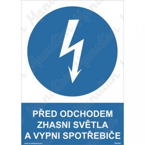 Tabulky, značky a samolepky "Před odchodem zhasni světla a vypni spotřebiče" jsou tištěny na vysoce kvalitním materiálu, barvami s vysokou odolností proti otěru a UV záření. Provedení je plně v souladu s požadavky právních a technických předpisů, zejména Nařízení vlády č. 375/2017 Sb., ČSN ISO 3864-1, ČSN ISO 3864-2, ČSN ISO 3864-3, ČSN ISO 3864-4.Příkazové tabulky - Před odchodem zhasni světla a vypni spotřebiče