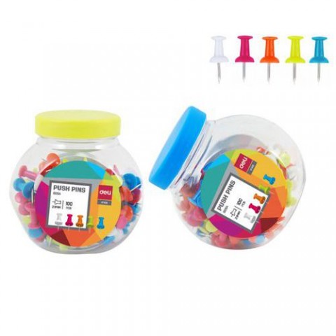 Připínáčky s barevnou hlavičkou v plastové dóze. Vhodné pro použití na korkové a textilní nástěnky, pro barevné vyznačení bodů a tras na mapách. Zářivé barvy. Dóza obsahuje 100 kusů barevných připínáčků o délce 23mm. Mix barev.Připínáčky DELI dóza barevné, 100ks