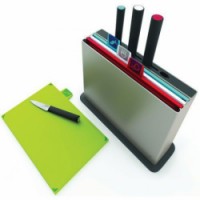 Sada 4 krájecích prkének 26x19 cm se stojanem Sada prkének na krájení v barvě Index Silver se dodává se 4 různými noži. Abyste krájeli správným nožem na správném povrchu. Barevné kombinace pro krájení ryb, masa, kuřete, zeleniny a chleba na různých krájecích deskách zabraňují křížové kontaminaci Krájecí desky mají protiskluzové nožičky a lze je mýt v myčce nádobí Police se snadno ukládají do regálu a skvěle vypadají na kuchyňské lince.Prkénka na krájení Index Advance + 8x nůž_Joseph Joseph