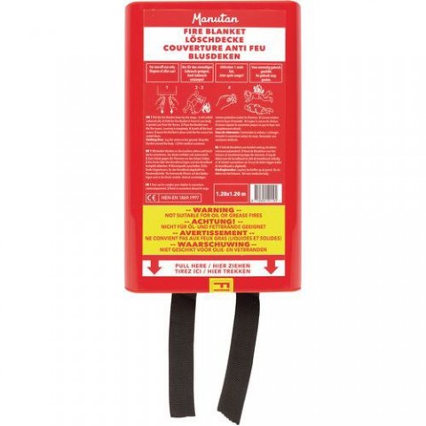 Hasicí deka ze skleněných vláken v plastové krabičce. Slouží k uhašení požáru nebo záchraně osob před plameny. Vhodné umístění do míst, kde není poblíž hasicí přístroj.Protipožární deka Manutan Expert