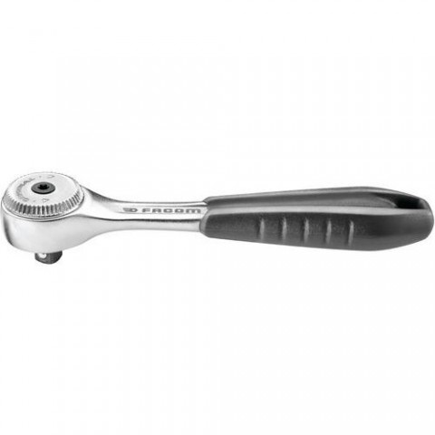 Standardní ráčna 1/4'' R.151B. 72zubý mechanismus umožňuje 5° zpětný krok. Kompaktní hlava a inverze pomocí otočného klobouku. Ergonomická rukojeť z odolného elastomeru je odolná vůči rozpouštědlům. Otvor v rukojeti pro zavěšení je ideální při práci ve výškách. Povrchová úprava saténový chrom.Ráčna 1/4 Facom R.151B