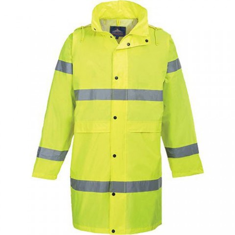 Výstražný nepromokavý plášť s vysokou viditelností. Pláštěnka má lepené švy, 2 přední hluboké kapsy, integrovanou skládací kapuci v límci a rukávy zakončené elastickou manžetou. Otvory na zádech zvyšují prodyšnost a komfort při nošení. Zapínání na druky. Vrchní tkanina 100% Polyester, 190T, Plain Weave, PVC zátěr 200 g. Podšívková tkanina (pouze sedlo) 100% polyester síťovina 60 g. Tkanina odráží 98 % UV záření (50+ UPF), vodní sloupec 5 000 mm. Splňuje normy EN 343:2019 Třída 3:1 X (WP 5,000mm) a EN ISO 20471 Třída 3.Reflexní Hi-Vis pláštěnka, délka 100 cm, žlutá