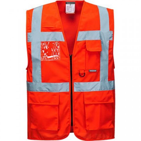 Vesta s nízkou hmotností, reflexními prvky a výrazně červenou barvou zvyšuje viditelnost pracovníků. Vybavená je smyčkou na radiostanici, dvojitým držákem ID karty, očkem pro připevnění např. klíčů, dvěma velkými a dvěma malými kapsami. Přední zapínání na zip. Tkanina 100% polyester, Warp Knit 125 g/m2. Splňuje normy EN ISO 20471 Třída 2, AS/NZS 4602.1:2011 Třída D/N, ANSI/ISEA 107-2015 TYP R Třída 2.Reflexní manažerská vesta Berlin Hi-Vis, červená
