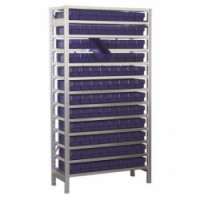 Kovový regál s třinácti policemi a vysouvacími boxy je určen k přehlednému uskladnění širokého sortimentu drobného materiálu v dílnách, skladech, garážích, obchodech atd. K boxům je možno dokoupit dělící příčky. Povrchová úprava pozinkováním.Regál s 96 zásuvnými boxy, hloubka 40 cm