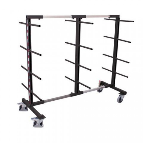 Oboustranné teleskopické vozíky se 12 nosnými rameny na každé straně s délkou 375 mm. Možnost nastavení výšky nosných ramen, maximální nosnost na jednu úroveň je 60 kg. Plynule nastavitelná šířka vozíku 840 - 2 200 mm nebo 840 - 3 200 mm. Pojízdnost zajišťují 2 otočná kola a 2 otočná kola s brzdou. Šedé pneumatiky z termoplastické pryže nezanechávající stopy na plastovém ráfku s přesnými kuličkovými ložisky, kryty proti namotávání nití.Regálové vozíky s nosnými rameny, oboustranné, 24 ramen