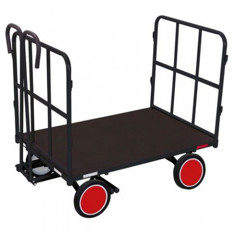 Ocelový ruční vozík se dvěma trubkovými bočnicemi na čelních stranách, výška stěn 750 mm. Oj s měkkou rukojetí. Reflexní prvky na ocelové konstrukci. Automatická parkovací přední brzda a automatický tlumený návrat do klidové polohy. Ložná plocha z voděodolné lepené překližky s protiskluzovým povrchem. Nafukovací nebo plná gumová kola na plastovém ráfku s kuličkovými ložisky.Ruční vozíky s tažným madlem a 2 bočnicemi, do 700 kg