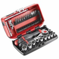 Sada obsahuje: 1 x 1/4" ráčna s otočnou rukojetí: R.360. 10 x 1/4" 12bodové nástrčné hlavice v palcích: R. 7/32" – 1/4" – 9/32" – 5/16" –11/32" – 3/8" – 13/32" – 7/16" – 1/2" – 9/16". 2 x 1/4" standardní nástavce: L 55 mm (R.209) – L 100 m (R.210). 1 x 1/4" univerzální kloub: R.240A. 1 x 1/4" krátká rukojeť šroubováku: R.236C. 1 x 1/4" zásuvka s držákem bitů se standardním zajišťovacím kolíkem: R.235. 1 x 1/4" šestihrotý nástrčný bit – 1/4" čtyřhran: ECR. 11 x bity řady 1 – pohon 1/4"/6,35 mm – D 25 mm: - ES.T pro šrouby s drážkovanou hlavou: 4,5 – 6,5 – 8 mm. - ED.T pro šrouby Posidriv: PZ1 – PZ2 – PZ3. - EH. pro 6bodové šrouby se zápustnou hlavou: 1/4" – 1/8" – 3/16" – 5/32" – 7/32". Kufr: BV.RNANO-U. Hmotnost: 0,850 kg.Sada nano nástrčných klíčů a bitů Facom, 40 ks